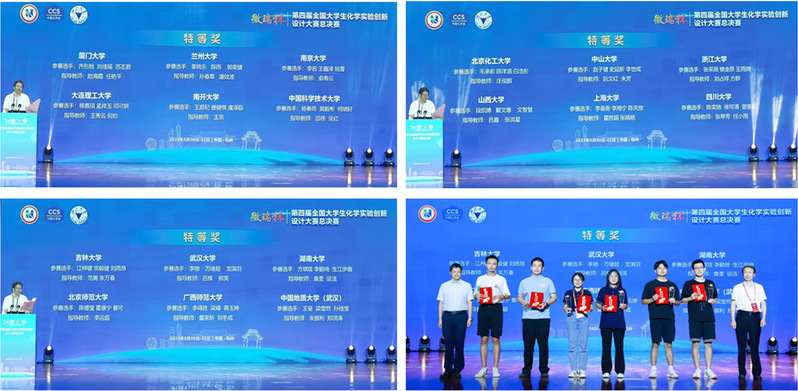 “全国大学生化学实验创新设计大赛”是教育部官方认可的57项最具含金量、最具参赛价值的顶级全国大学生A类学科竞赛之一。今年,共有来自447所高校共1076支队伍参加本届大赛。经过全国七大赛区的激烈初赛角逐,评选90所高校的90支参赛队伍会师全国总决赛。总决赛釆用参赛队及评委双盲评审制,竞赛成绩由书面评审和现场答辩两部分组成,各参赛队伍紧扣“创新、设计”主题,通过讲解、现场演示与答辩等形式展示作品。经过两轮激烈比拼,最终评选出总决赛的最高奖项——18项特等奖(图1)。