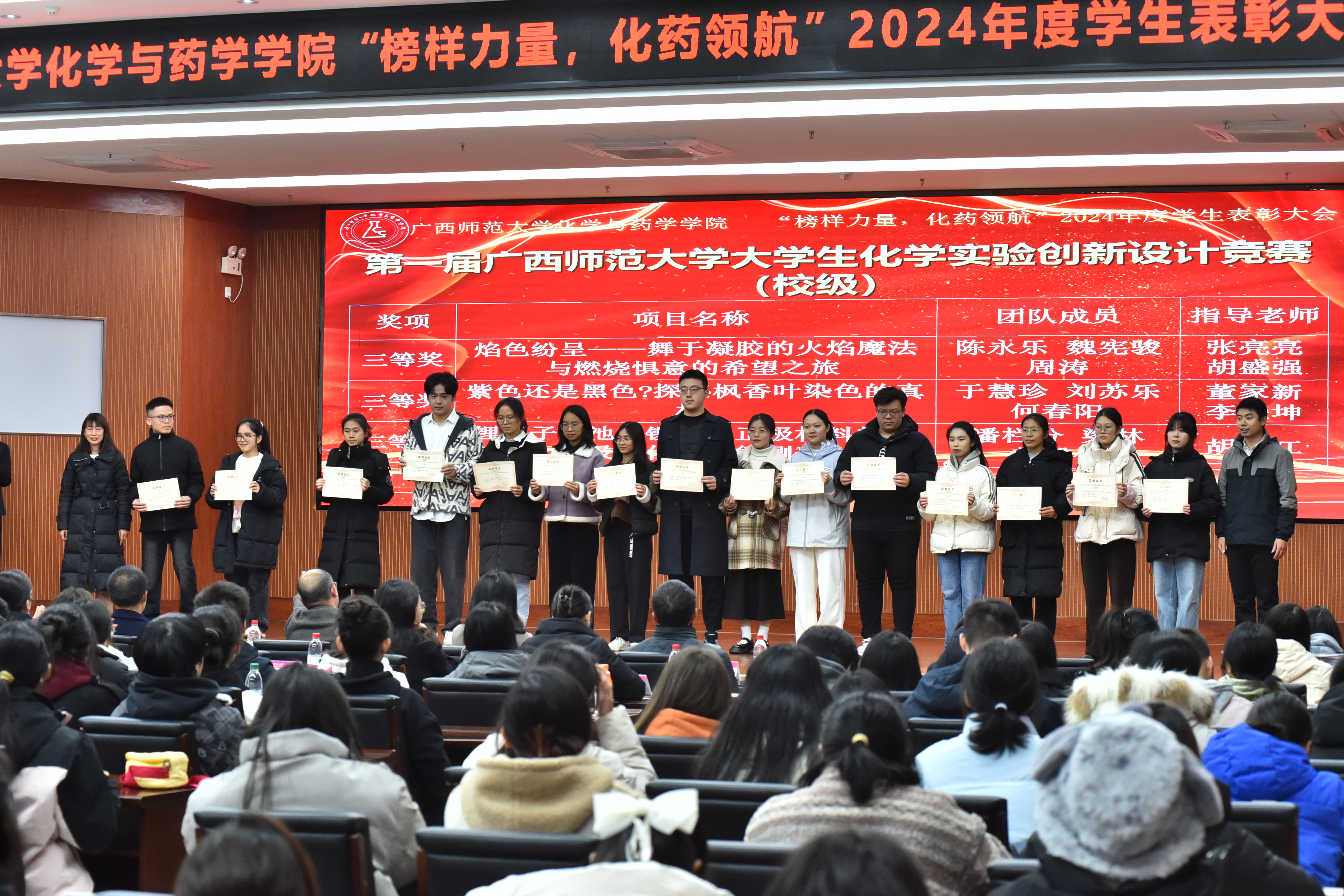 为激发广大师生对化学类本科实验教学项目改革与创新的热情和参与度,构建实验创新能力的展示与交流平台,推动实践教学改革,激发学生的创新意识和创新能力,教务处、化学与药学学院和化学国家级实验教学示范中心联合举办的“第一届广西师范大学大学生化学实验创新设计竞赛”于2024年12月15日顺利落下帷幕,并举行了颁奖仪式。