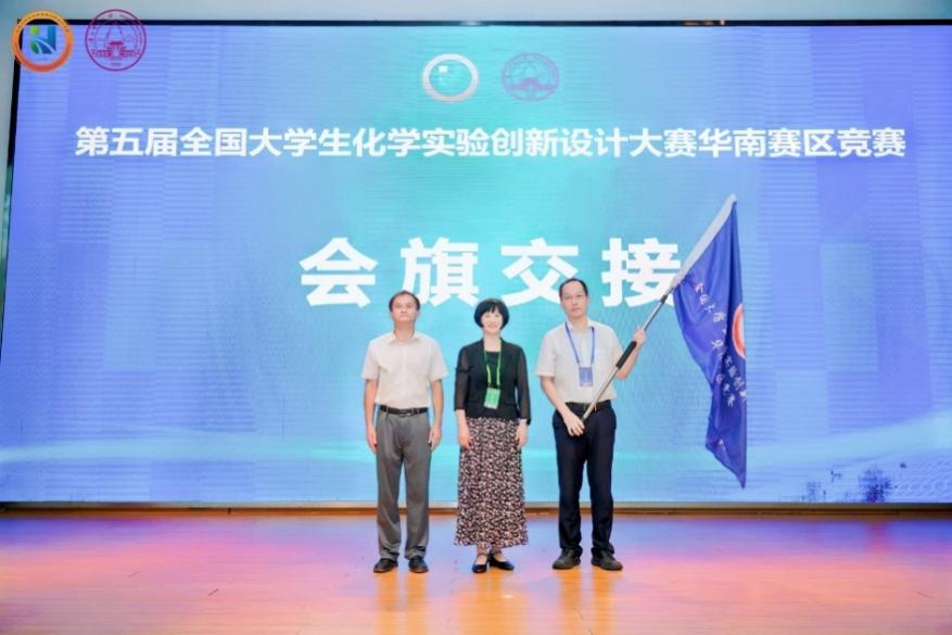 7月27日下午,大赛颁奖典礼在广西师范大学育才校区田家炳教育书院举行,广西师范大学化学与药学学院院长陈振锋教授主持颁奖典礼,广西师范大学副校长沈星灿教授出席并致辞。她向获奖队伍表示热烈祝贺,向评委专家及全体工作人员等致以诚挚感谢。大赛委员会副主任、大连大学校长孟长功教授从化学教育发展的专业视角,为高校化学实验教学改革路径与拔尖创新人才培养方向提供了系统性指导。大赛委员会副主任、南京大学张剑荣教授随后对本次参赛作品进行了专业点评,深入剖析了亮点与不足,并提出了前瞻性建议。闭幕式上,与会领导及嘉宾共同为获奖队伍代表颁发了荣誉证书。在华南赛区竞赛委员会主任、厦门大学朱亚先教授的主持下,本届承办方代表陈振锋教授与下届承办方代表福州大学化学学院院长钟羽武教授庄重完成了竞赛会旗交接。钟羽武教授接过会旗后发表致辞,承诺将秉持办赛初心,全力保障下届赛事的顺利举办与品质提升。至此,第五届全国大学生化学实验创新设计大赛华南赛区竞赛圆满落幕。