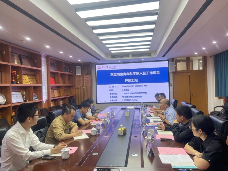 2025年9月23日,广西师范大学化学与药学学院举行“东盟杰出青年科学家来华入桂工作项目”(以下简称“东盟杰青项目”)开题报告会。马来西亚籍Tang Wai Kit(邓伟杰)博士作为项目人选,作了题为“人工智能辅助药物设计”的开题报告。自治区科技厅科技人才与科普处一级主任科员童彬、广西东盟技术转移中心项目主管张夏主任、学校科技处、学院党政主要负责人和相关领导参加会议。