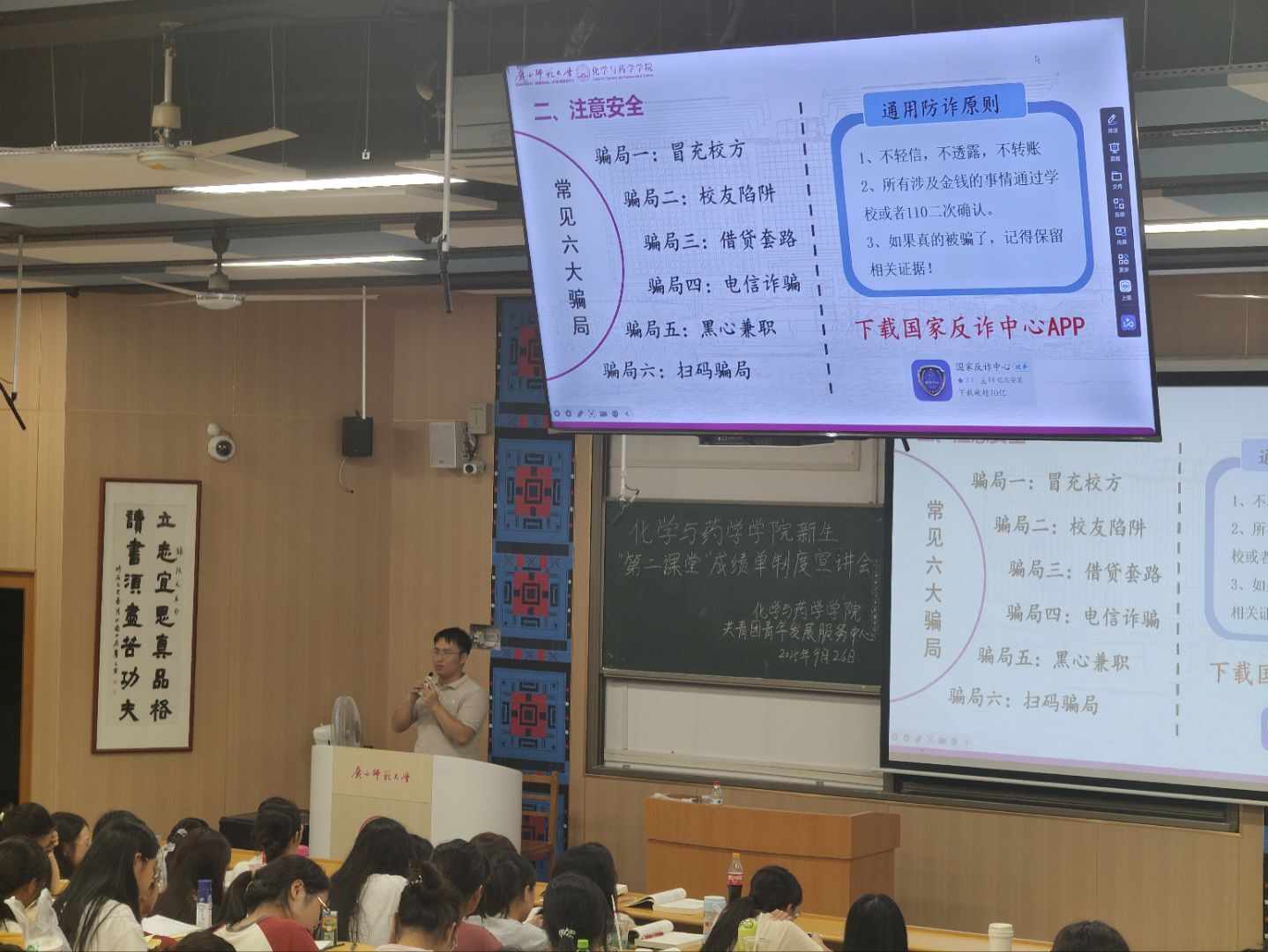 自2025级新生入学以来,化学与药学学院聚焦新生生命财产安全,精心组织开展反诈宣传教育活动,通过“警校联动+自主学习+互动分享+日常渗透”的模式,将反诈宣传教育融入校园生活各场景,为新生筑牢反诈“防火墙”。