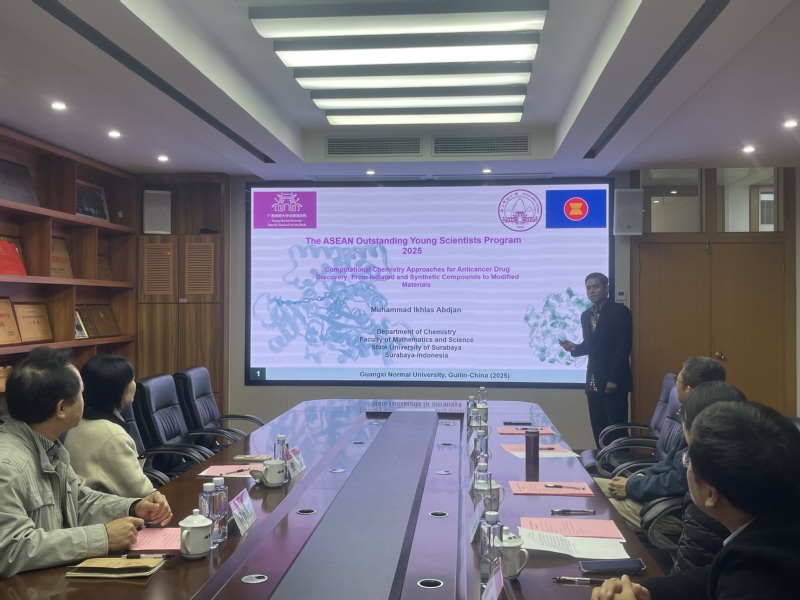 2025年11月11日上午,广西师范大学化学与药学学院举行“东盟杰出青年科学家来华入桂工作项目”(以下简称“东盟杰青项目”)开题报告会。印度尼西亚籍 Muhammad Ikhlas Abdjan(穆罕默德·伊赫拉斯·阿布詹)博士作为项目人选,作了题为“抗癌药物发现的计算化学方法:从分离与合成化合物到改性材料”的开题报告。广西东盟技术转移中心项目主管张夏、学校科技处、学院党政负责人和相关学科老师参加会议。
