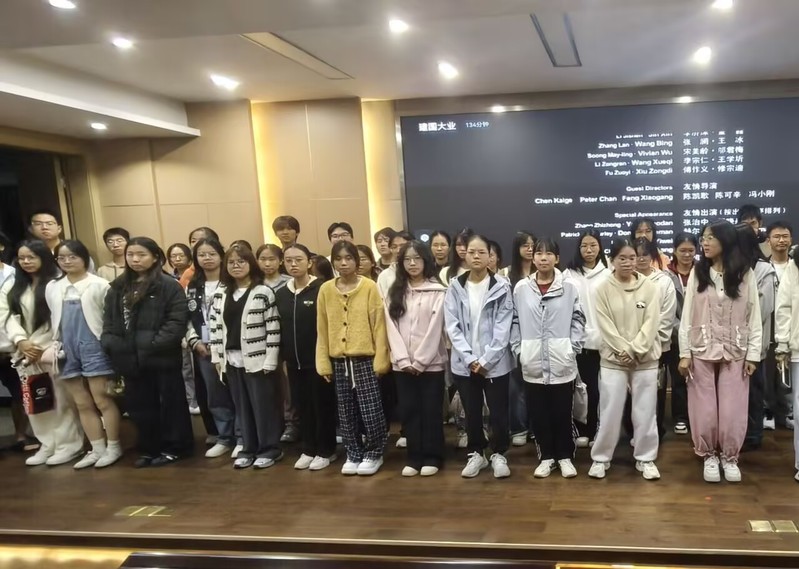 活动当晚,报告厅内座无虚席,学生们怀着庄重的心情共同观看了这部恢弘史诗。《建国大业》通过恢弘的历史叙事与细腻的人物刻画,再现了1945年抗日战争胜利到1949年建国前夕的波澜壮阔历程,重点展现了中国共产党团结各民主党派、无党派人士和广大人民群众,共同争取民族独立与人民解放的艰辛探索,以及开国大典等历史性时刻的庄严与振奋。当影片播放到“政协会议代表共商国是”“毛泽东主席在天安门城楼宣告中华人民共和国成立”等场景时,现场学生们深切感受到老一辈革命家的使命担当与建国不易,不少同学眼中闪烁着激动的泪光,全场多次响起自发的掌声,致敬那段改天换地的奋斗史诗。影片结束后,师生围绕“建国历史对当代青年的启示”展开讨论,分享对“没有共产党就没有新中国”的深刻感悟,并合影留念。