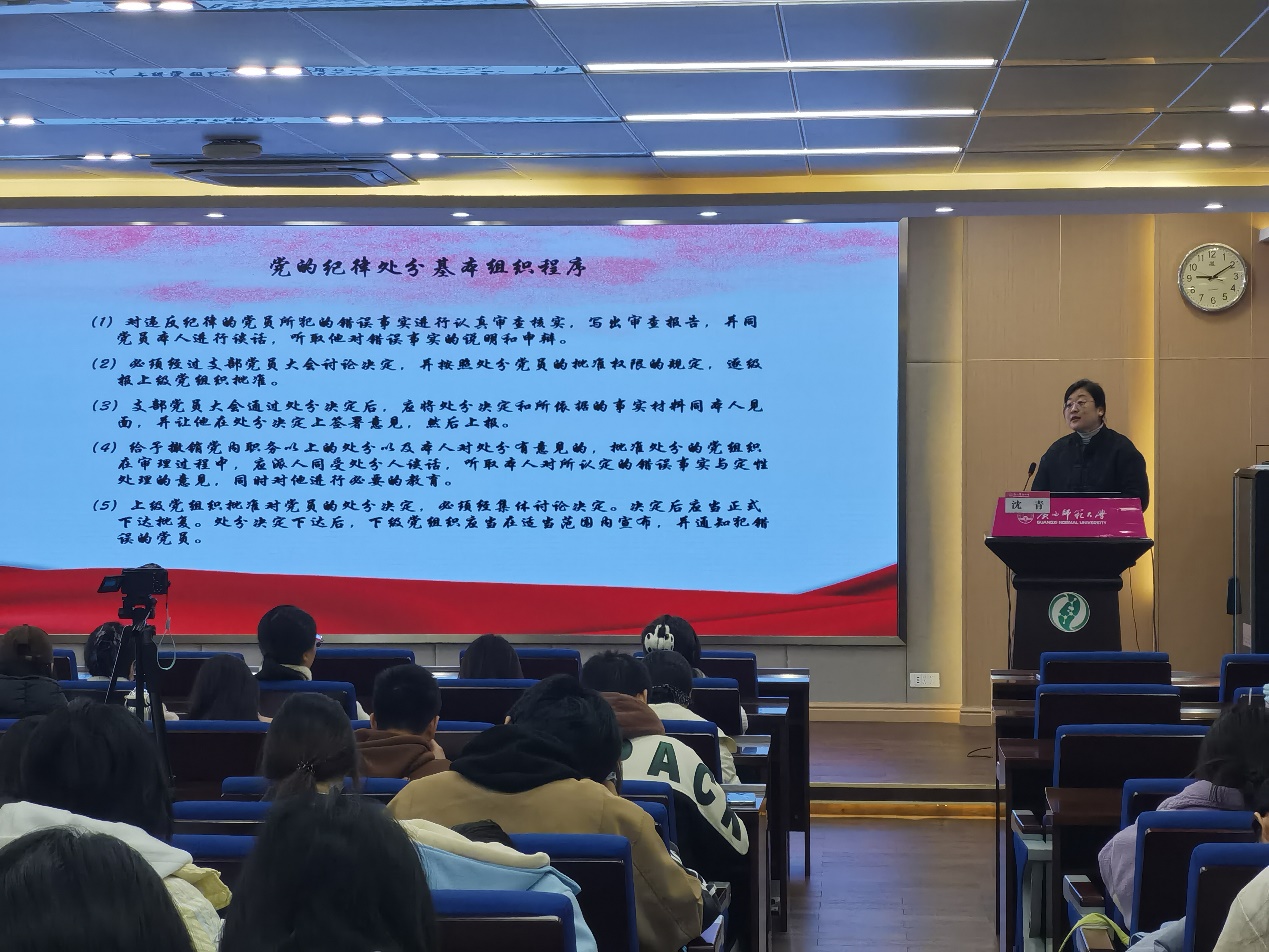 活动伊始,沈老师围绕党的纪律核心要义展开解读,详细介绍了纪律的特征、基本内容和处分种类,并通过“纪律红线与学业发展”“规则意识与集体荣誉”等贴近学生的话题互动,让大家深刻认识到纪律不仅是约束更是保障。