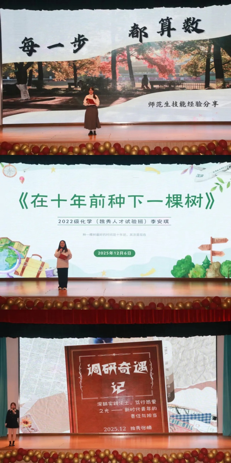 榜样分享环节干货满满。第十九届“挑战杯”全国二等奖项目负责人李安琪、全区师范生教学技能大赛一等奖获得者何小萌、社会实践优秀学生代表张楠,分别结合自身经历分享竞赛心得与成长故事,为2025级新生带来一堂生动的朋辈引领课,引发现场阵阵共鸣。