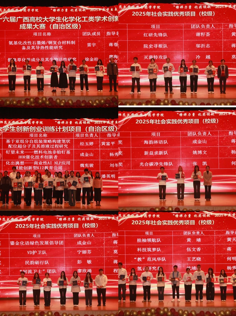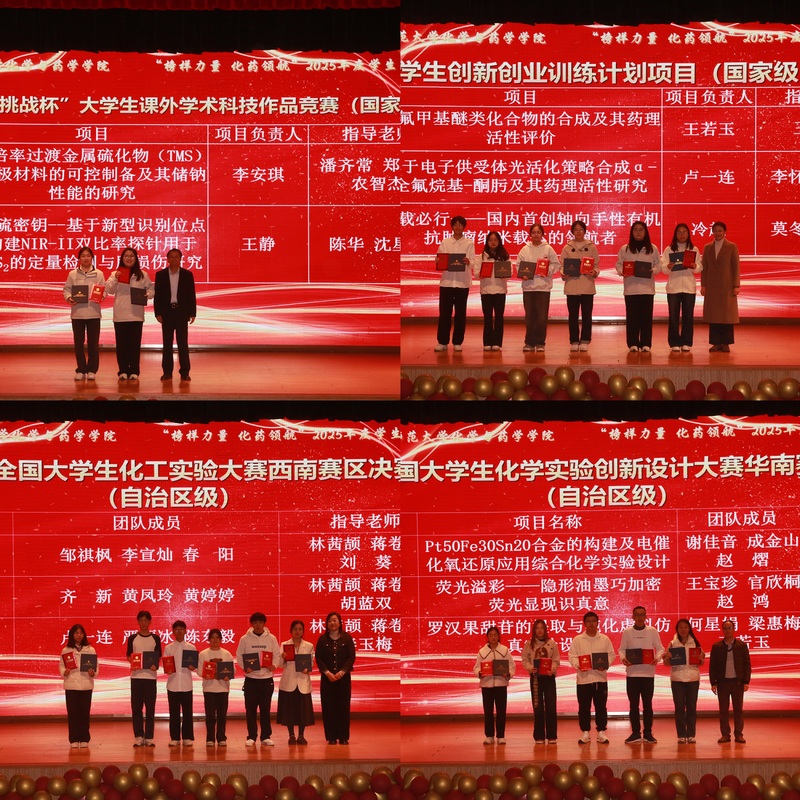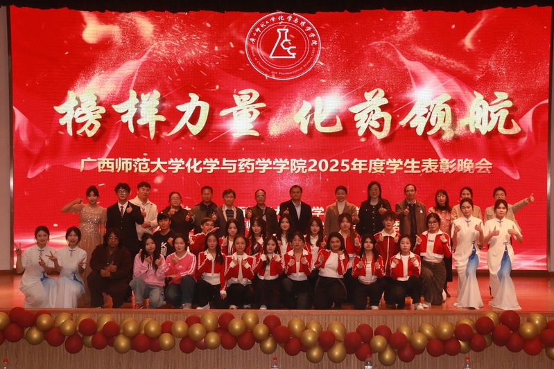 “让我们再次用热烈的掌声祝贺以上获奖同学!”12月6日晚,广西师范大学育才校区田家炳书院一楼报告厅星光璀璨、掌声雷动,化学与药学学院“榜样力量,化药领航”2025年度学生表彰晚会隆重举行。学院院长陈振锋、领导班子成员、专业首席教授、教研室主任代表、辅导员及获奖学生代表、2025级新生观众代表等350余人齐聚一堂,共同见证化药学子的成长荣光。