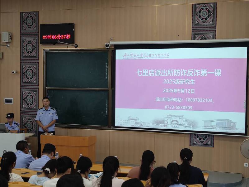 为切实提升2025级研究生新生的防诈反诈意识和自我保护能力,筑牢校园安全防线,9月12日上午,化学与药学学院在理科综合楼304教室举行2025级研究生新生防诈反诈第一课。辖区七里店派出所副所长欧阳华勇、派出所反诈专干,学院党委副书记卢洁及研究生辅导员黄燊出席活动,2025级全体研究生新生参加。