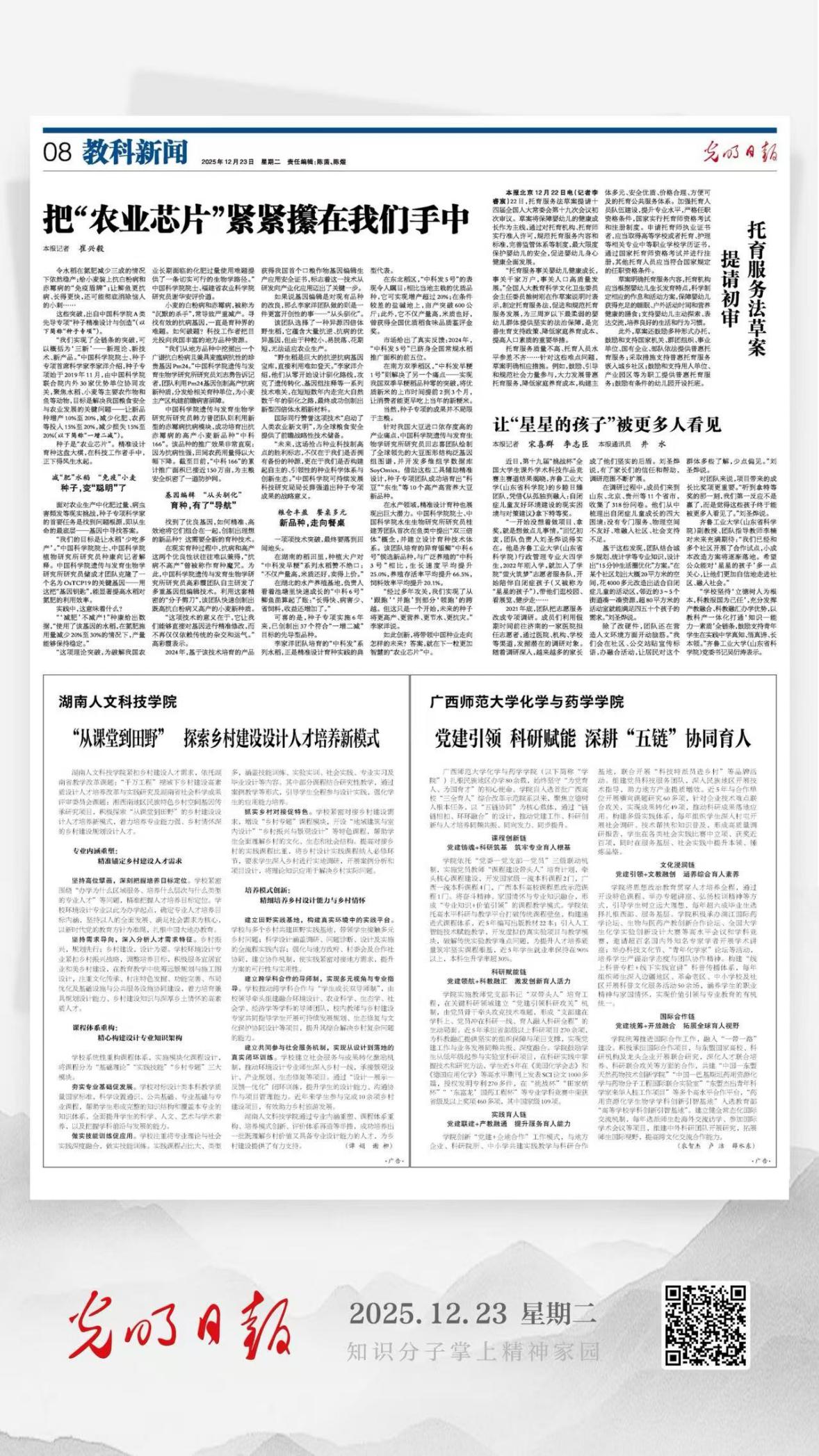12月23日,《光明日报》以《广西师范大学化学与药学学院:党建引领 科研赋能 深耕“五链”协同育人》为题,关注报道广西师范大学化学与药学学院育人工作成效。