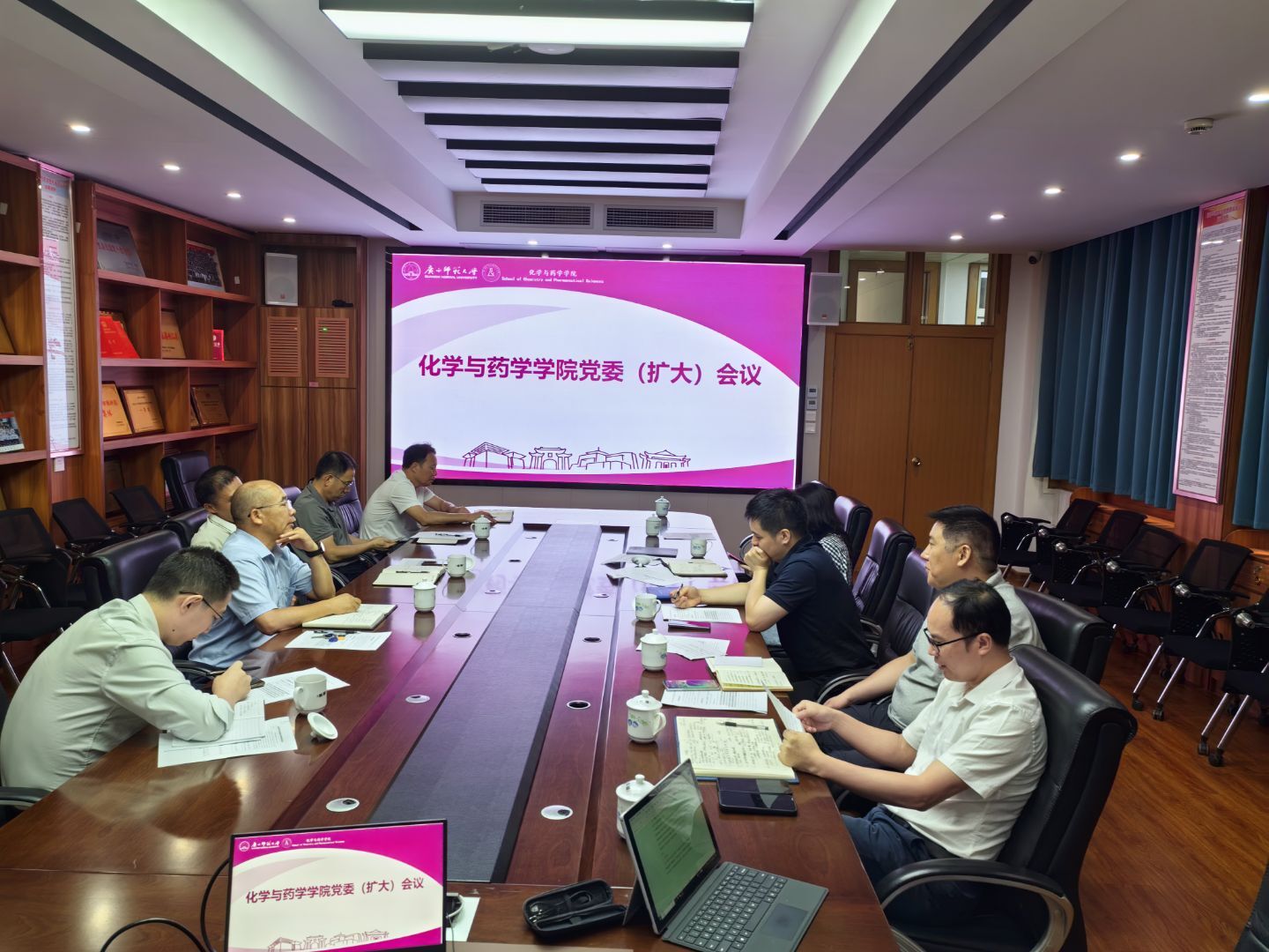 为深入推进全面从严治党,持续加固中央八项规定精神堤坝,以优良党风引领校风学风建设,为学院高质量发展提供坚强作风保障,6月10日,化学与药学学院在育才校区化学楼212会议室召开党委扩大会议,集中学习习近平总书记发表在《求是》杂志的重要文章《锲而不舍落实中央八项规定精神,以优良党风引领社风民风》。学院领导班子、党委委员、纪委委员、专职组织员参加会议。会议由学院党委负责人主持。