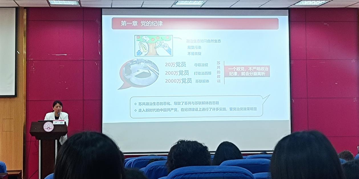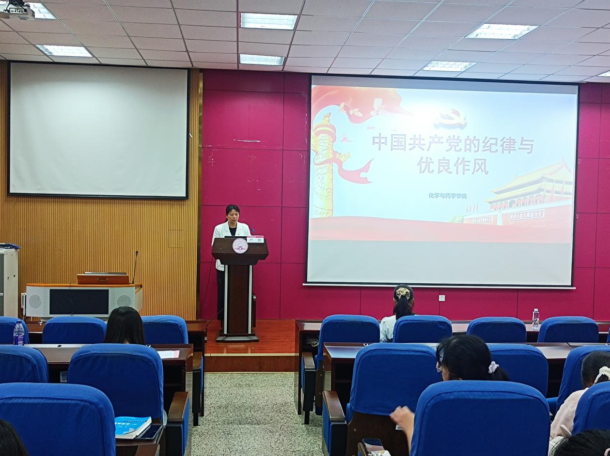 为深入学习贯彻习近平新时代中国特色社会主义思想,巩固拓展主题教育成果,强化入党积极分子纪律作风教育,筑牢青年学子思想根基,落实学思践悟新思想,5月18日,化学与药学学院在在育才校区第二理科综合楼111报告厅开展《党的纪律与优良作风》专题党课,学院党委副书记卢洁担任主讲人,本次党课分三个模块进行详细阐述。