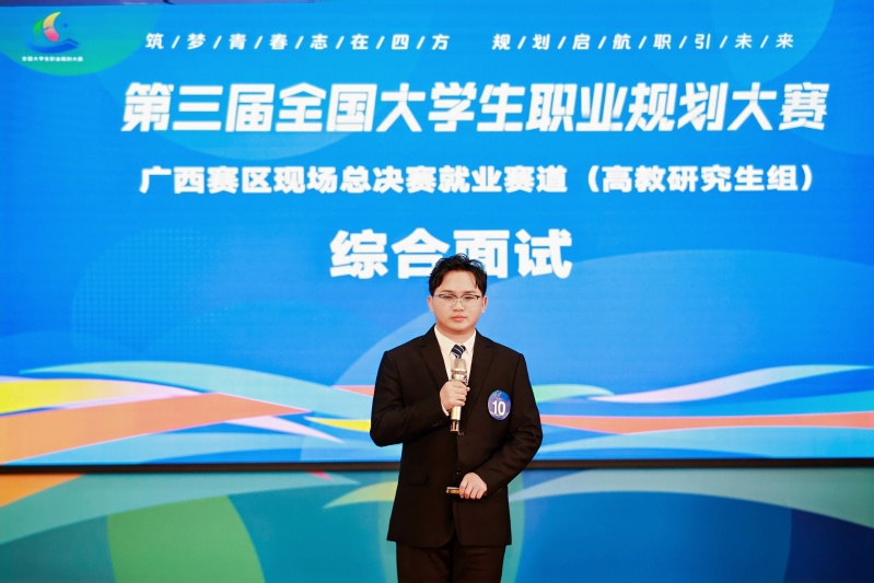 在刚刚落幕的第三届全国大学生职业规划大赛广西赛区总决赛中,我院化学专业博士研究生黄志洋同学凭借出色的职业规划能力、扎实的专业素养和精彩的现场展示,在竞争激烈的高教研究生组就业赛道中脱颖而出,荣获银奖!