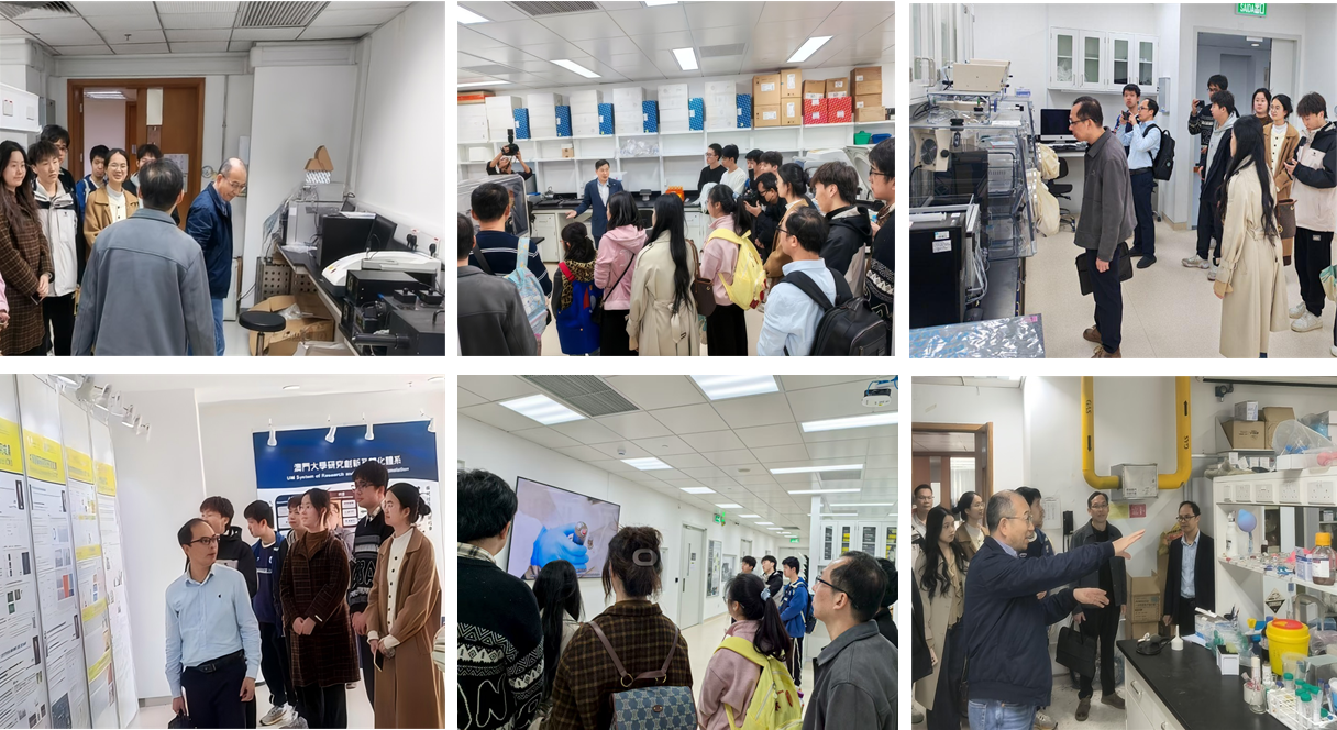 随后,我院师生实地参访了澳门大学多个重点实验室、仪器共享平台和基础教学实验室,近距离观摩了在合成化学、药物分析、材料表征、细胞生物学等领域的前沿设备与技术支持体系。平台负责人详细介绍了大型仪器服务教学科研的开放共享模式与运行机制。此外,我院师生与正在开展“澳门大学开放日”活动的澳大师生进行了现场互动,真切感受到其浓厚的科研氛围与跨学科融合的人才培养特色。