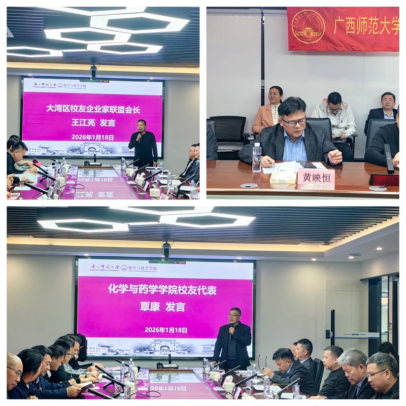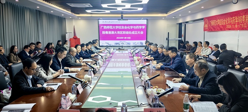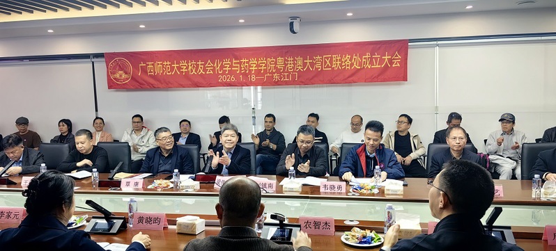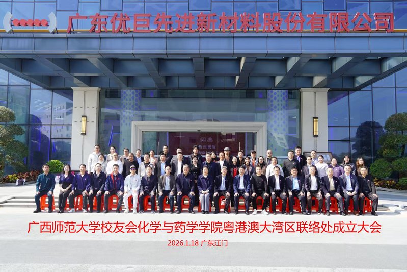 2026年1月18日上午,广西师范大学校友会化学与药学学院粤港澳大湾区联络处成立大会在广东江门广东优巨先进新材料股份有限公司隆重举行。学校党委常委、副校长、校友会常务副会长黄晓昀出席并讲话。学校粤港澳大湾区校友会、粤港澳大湾区校友企业家联盟理事会、企业家校友联谊会,东莞、佛山、肇庆、清远、惠州、珠海、江门、广州、深圳校友会,校友会化药学院南宁联络处等校友组织代表,学院师生及校友代表近60人齐聚一堂,共同见证这一重要时刻。