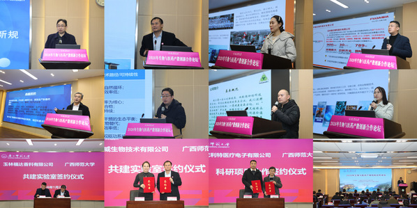 本届论坛还同期举行了校企合作签约仪式。我校分别与玉林福达香料有限公司、桂林华诺威生物技术有限公司签署了联合实验室共建协议,双方将分别在香料成分提取与深加工、高端护肤原料研发等方面开展深度合作。同时,与桂林优利特医疗电子有限公司签署了技术开发协议,将围绕血液分析荧光染料的制备开展联合攻关。