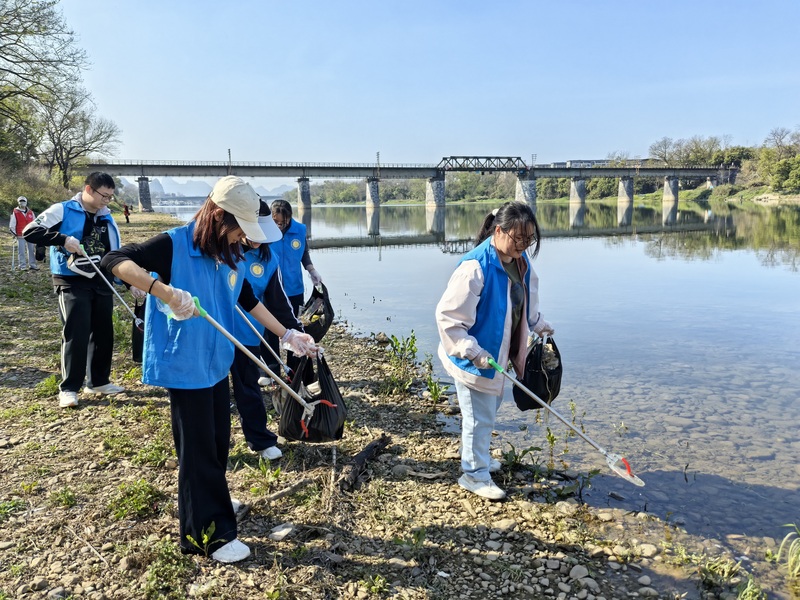 活动现场,青马班学员们身着志愿服装,手持垃圾夹、垃圾袋等工具,沿漓江沿岸开展环境卫生清理工作。大家分工协作、认真细致,重点清理河岸草丛、石缝中的塑料袋、纸屑、烟头及各类生活垃圾,认真清理各个卫生死角,用双手为漓江“净颜”,改善沿岸环境面貌。清理过程中,学员们还主动向周边市民、游客宣传漓江生态保护知识,倡导文明出行、不乱扔垃圾、爱护自然环境,以实际行动传递环保理念,带动更多人参与到漓江保护中来。