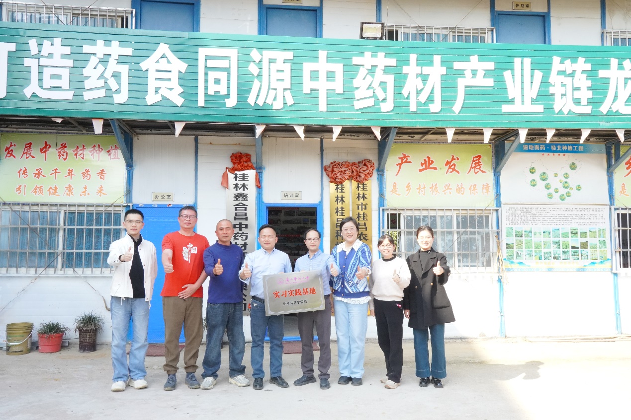 走访期间,学院团队深入广西西风农业发展有限公司的特色中草药和农产品加工车间,实地考察生产流程,围绕学生实习实训岗位拓展、中草药与农产品深加工技术合作等议题展开深入洽谈。在桂林鑫合昌中药材开发有限公司,团队走进中药材良种繁育基地及“百草园”示范种植区,详细了解企业在种苗培育、成分提取及质量监测等方面的技术需求。校企双方就学生实习实践、科研成果转化及技术协同攻关等议题达成多项共识。最后,学院与企业代表共同为广西师范大学化学与药学学院“实习实践基地”揭牌,标志着双方在人才共育、实践教学方面建立起长效合作机制。