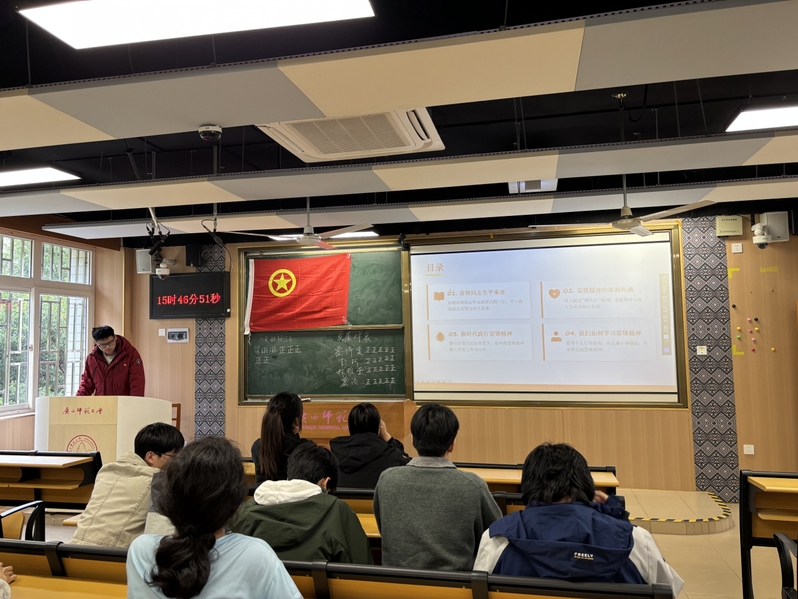 团课伊始,团支书赵博文同学带领大家重温雷锋同志的生平事迹,通过讲述雷锋助人为乐、爱岗敬业的感人故事,解读“奉献、友爱、互助、进步”的志愿精神与“钉子精神”的深刻内涵。随后,全体成员共同观看雷锋主题纪录片,直观感受雷锋精神跨越时空的永恒魅力,深刻领会其作为社会主义核心价值观生动体现的时代价值。