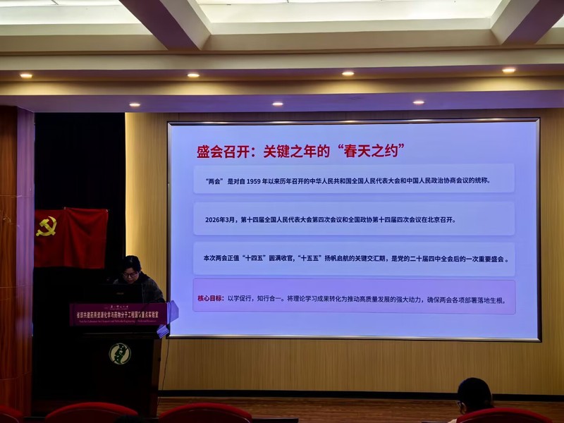 为深入学习2026年全国两会精神,化学与药学学院研究生第三党支部于2026年3月19日在国重楼2号楼101会议室开展“学习2026年全国两会精神,学深悟透精神实质,凝聚奋进磅礴力量”主题党日活动。研究生第三党支部全体党员积极参加本次活动,由曾远微同志担任主持人。