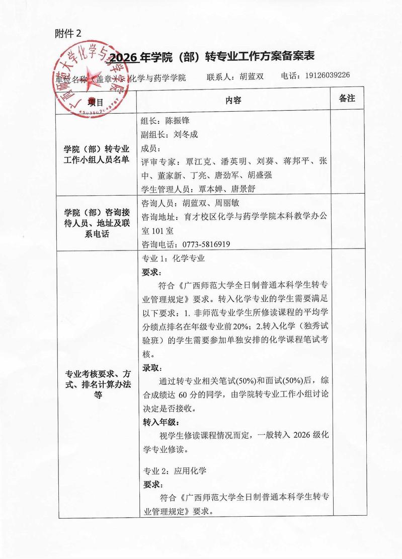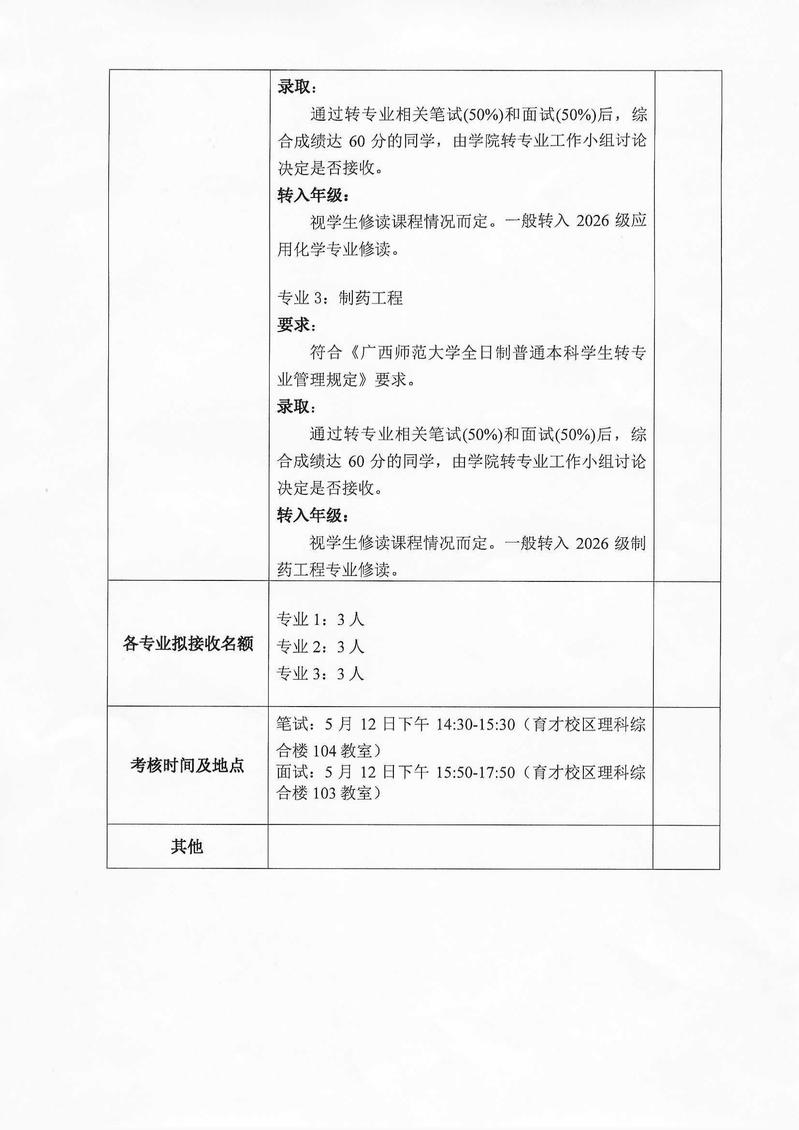 根据《广西师范大学全日制普通本科学生转专业管理规定》(师政教学〔2019〕78号)和《关于做好2026年全日制普通本科学生转专业工作的通知》(教务〔2026〕9号)有关规定,我院将开展2026年全日制普通本科学生转专业考核工作,考核分为笔试和面试两个环节,具体转专业工作安排如下: