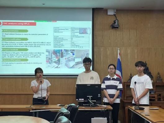 圆满完成实习任务归国后,为实现辐射效应,学院特地组织召开了此次交流分享会。会上,四位同学依次分享了他们在泰国期间的学术收获、文化体验与生活感悟。他们讲述了在国际一流实验室参与前沿研究的经历,展示了在天然药物技术创新方面的具体实践成果;也分享了如何适应异国文化、与来自不同背景的师生融洽相处的故事,展现了师大学子良好的精神风貌与跨文化适应能力。
