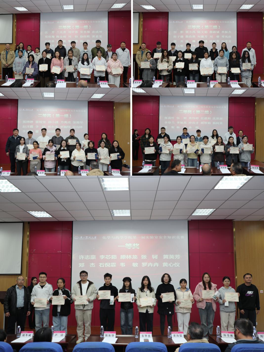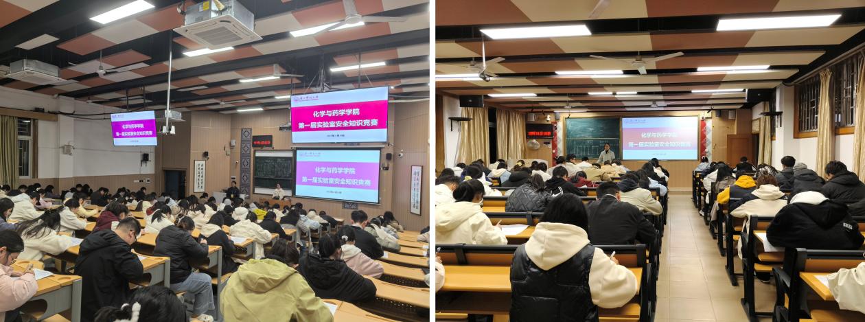 为深入普及实验室安全知识,强化师生安全意识,营造“安全第一,预防为主”的实验室文化氛围,由科技处与化学与药学学院联合举办的“广西师范大学化学与药学学院第一届实验室安全知识竞赛”于2025年11月21日圆满落幕。科技处、学院相关领导和负责人以及师生代表共200多人参加仪式。